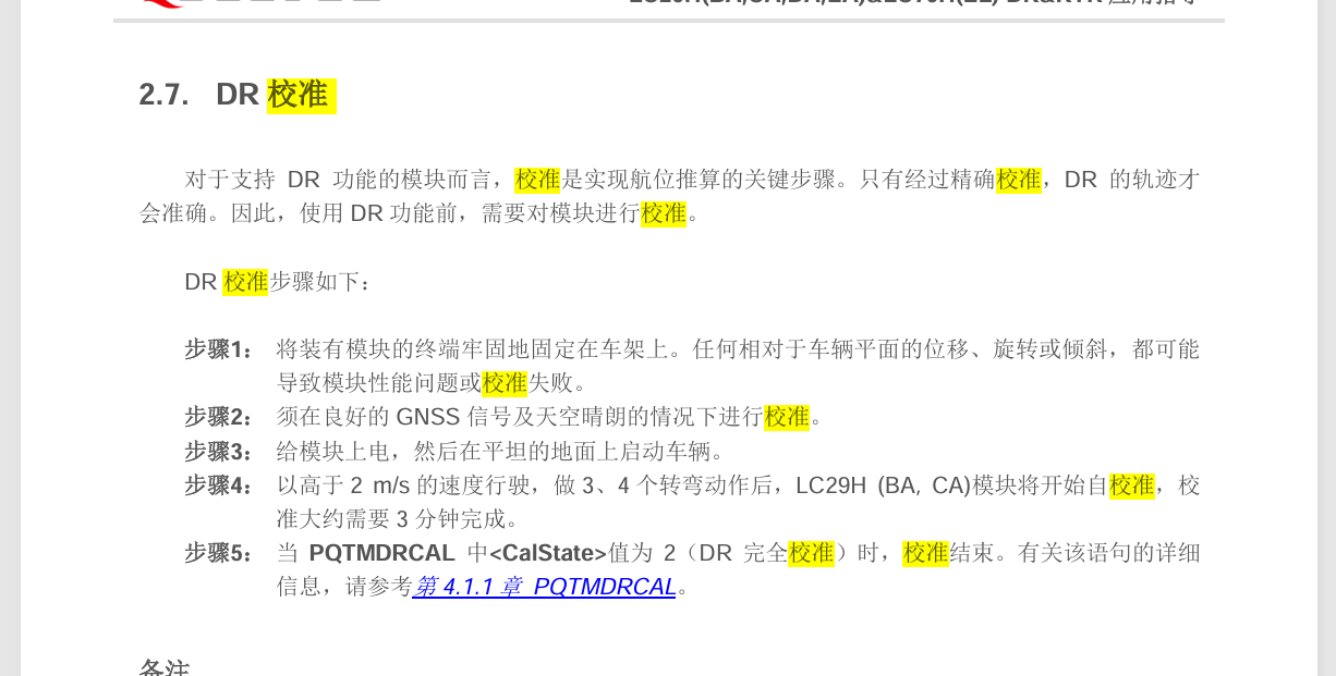 你好,注入或者不注入都可以进行校准,请确保模块与车辆之间保持刚性固定,若发生相对移动则会影响校准,此外校准方式可以参考DR应用文档:推荐绕八字持续校准5分钟左右,或者在方形的轨迹持续校准5分钟左右;可以打开PQTMDRCAL语句观察校准状态 打开PQTMDRCAL步骤: step1:$PQTMCFGMSGRATE,W,PQTMDRCAL,1,1*16 step2:$PQTMSAVEPAR*5A step3:$PQTMSRR*4B