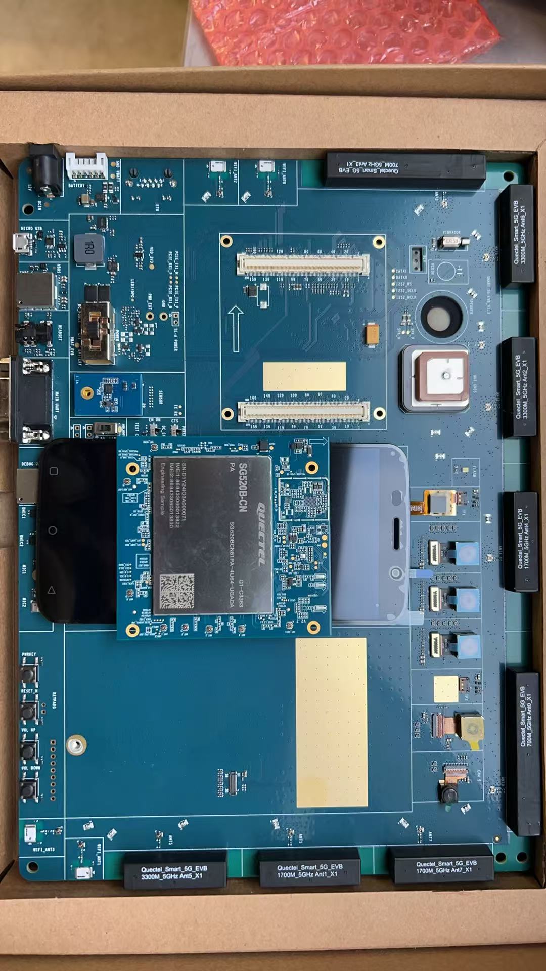 非常感谢,目前用了移远的官方evb,所有模组都是evb上附带的,附带evb照片如下,evb型号名smart-5g-evb