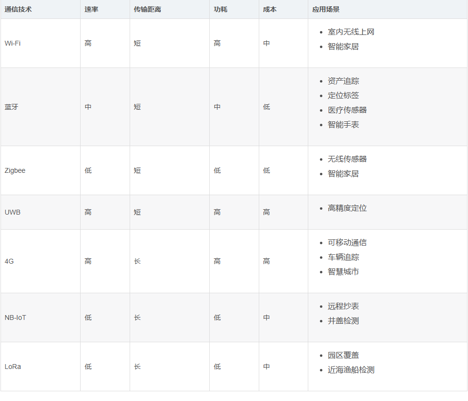 不同的物联网应用场景,对于无线通信的需求存在很大差别。下表展示了当前常见的物联网无线通信技术的特性和使用场景差异。