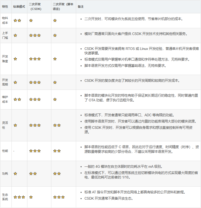 对于开发者而言,在基于标准模式使用模块时,主要的开发工作量在于主控中运行的用户 App。其业务代码中需要包含较为复杂的 AT 指令发送和返回值解析功能,例如对 URC(Unsolicited Result Code,非请求结果码)的处理等,因而对于初学者难度较大。除了 AT 指令功能,模块在标准模式下还可以作为无线网卡,为主控或其他上位机提供包括 PPP 拨号上网在内的一系列网络服务,此处不做赘述。