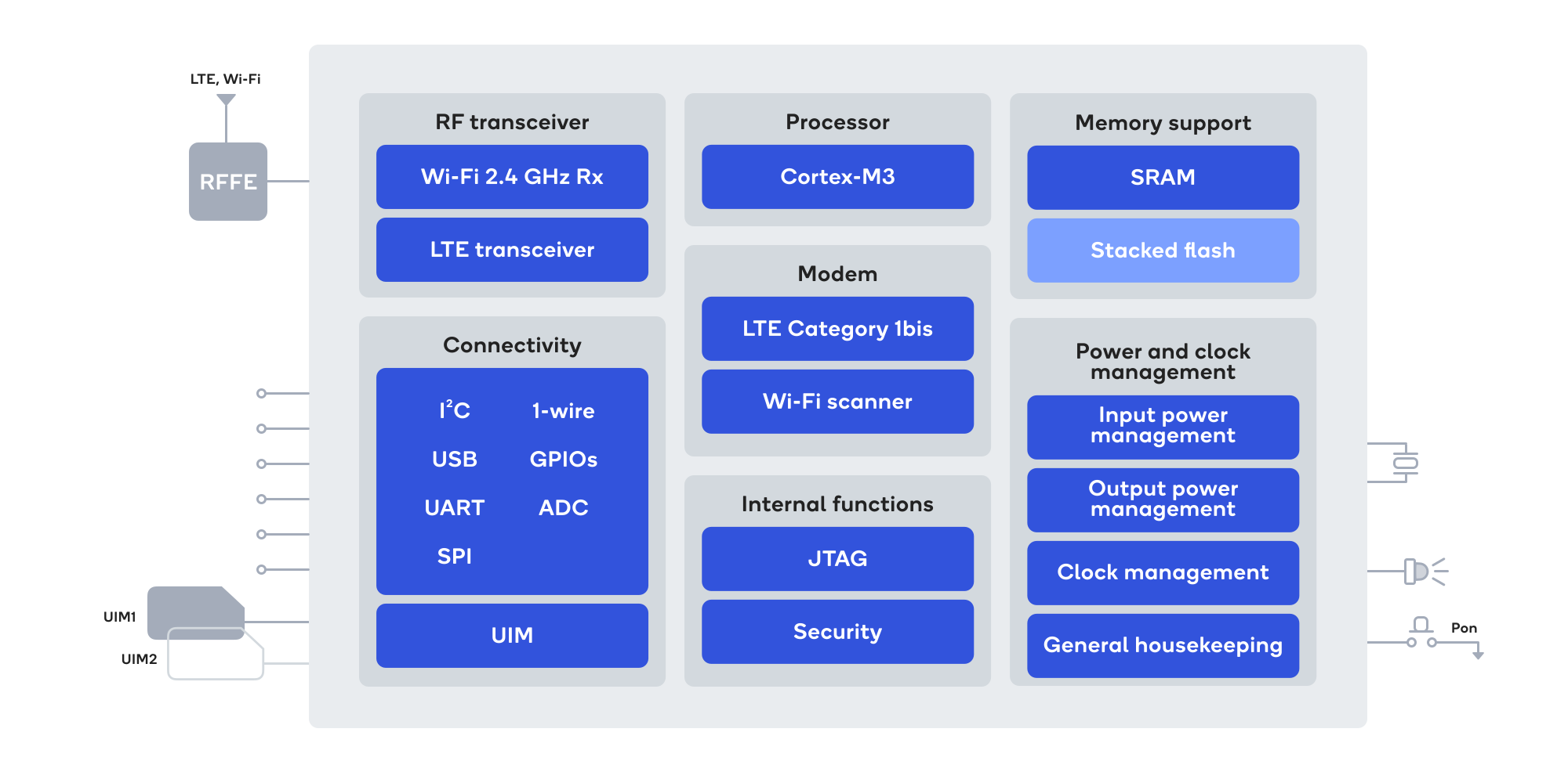 主芯片(Main Chip),部分厂家称之为基带(Baseband)芯片或调制解调器(Modem)芯片,是整个模块的核心。它的角色、功能和特性与手机中的 SoC(System on Chip,片上系统)十分相似。随着技术的发展和芯片制造工艺的提升,在现代模块中,主芯片通常已经集成了应用处理器(Application Processor,AP)、基带和射频的相关功能,运行着完备的操作系统(RTOS 或 Linux),对外提供包括 GPIO、USB 等在内的各种接口,并能够根据需求完成各类通信操作。从这个意义上看,模块既像一台没有屏幕和电池的手机,又像一种功能较为复杂的单片机。