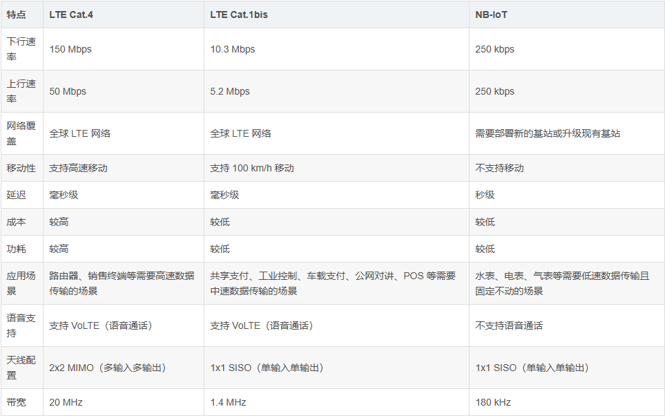 目前,在国内,物联网领域应用最多的蜂窝通信标准包括 LTE Cat.4,LTE Cat.1 和 NB-IoT。以下的表格对比了它们的特点。