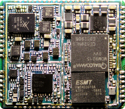 模块的内部结构较为复杂。如下图所示,可以看到包含主芯片(高通 MDM9607)、存储器、电源管理芯片、功率放大器、射频前端等多种集成器件,以及大量密集分布的小尺寸封装的电阻、电容等元件。显然,模块的复杂度和精密度是远超传统电路板的。