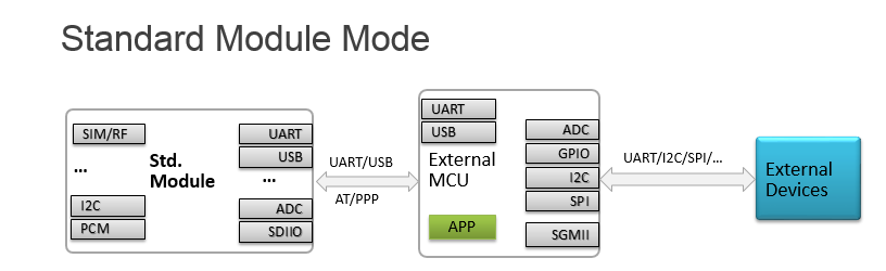 如上图所示,在标准模式中,模块与主控(MCU,如 STM32)之间通过 UART 或 USB 接口相连接,基于 AT 指令进行双向交互。不难看出,MCU 是整套系统的核心,通信模块是作为 MCU 的一个独立的功能外设的角色而存在的。系统的主要业务逻辑(用户应用,App)在 MCU 中运行,其他外设(图中的 External Devices)通过 UART、I2C 等接口与 MCU 相连,受 MCU 控制。
