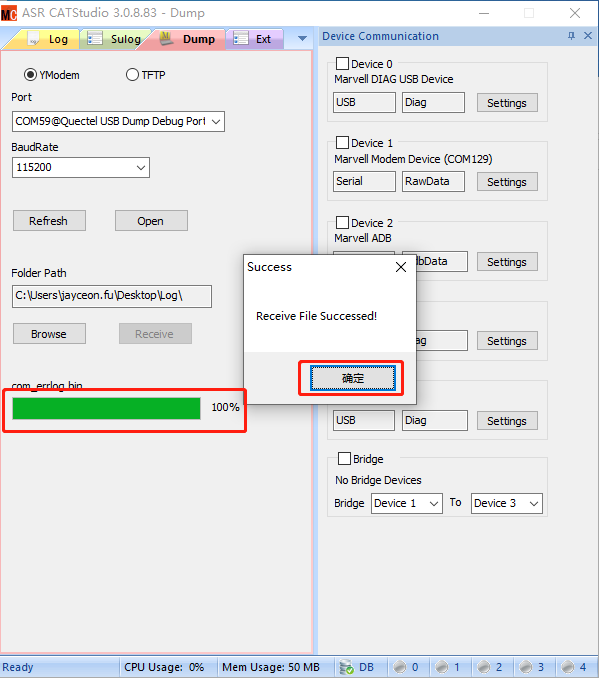 点击图中的⑥处的“Receive”按钮,开始dump文件的导出,并等待dump文件导出结束。当文件导出结束时,会弹出窗口提示用户,用户点击“确定”即可。如下图所示: