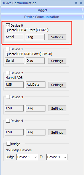 经过步骤1后会进入如下界面,点击右下角的“Device Communication”选项,弹出对应配置界面后,默认选择“Device 0”,点击“Settings”。