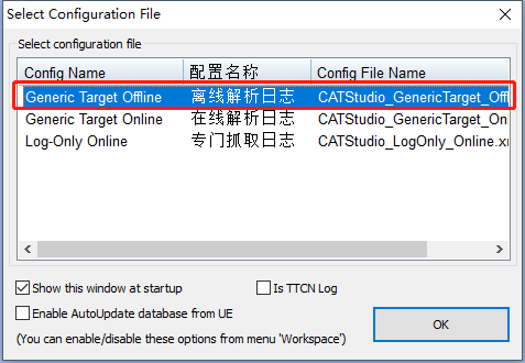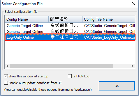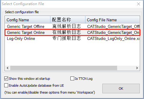 打开CATStudio软件,默认会弹出下图所示界面,选择“在线解析日志”选项,并点击“OK”。