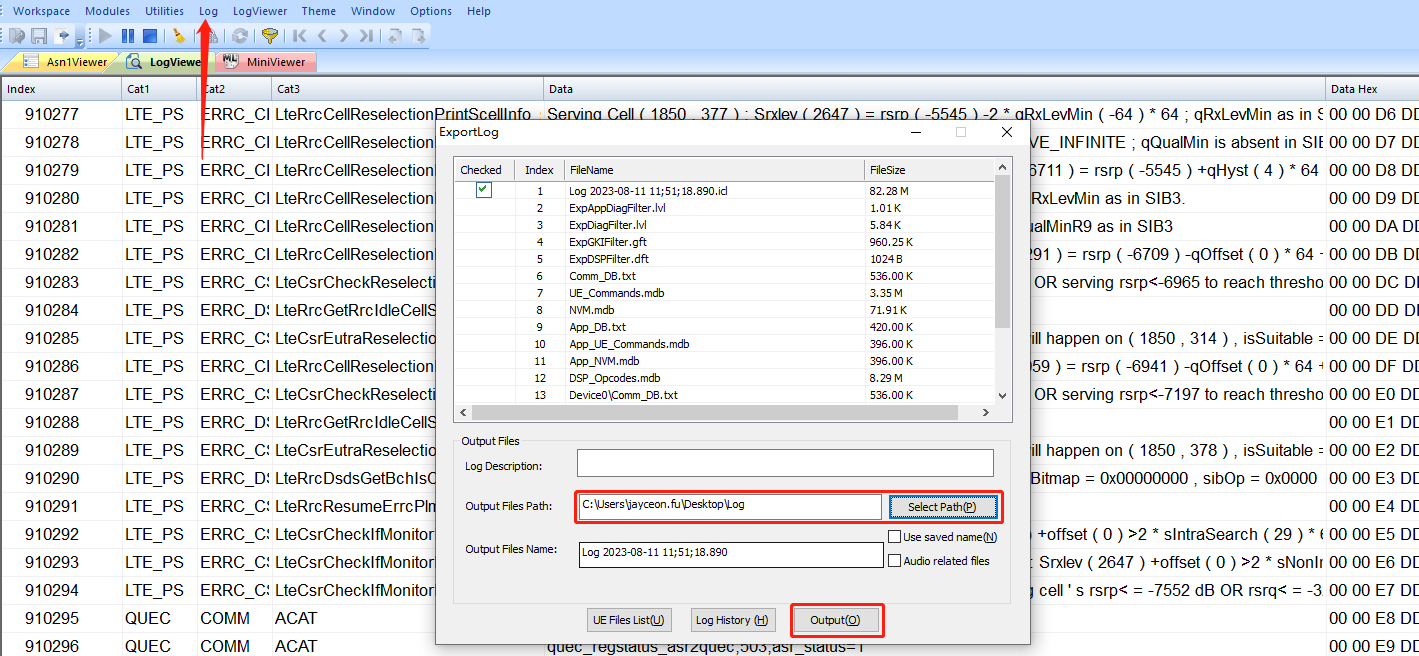 点击“Output”按钮,等待Log文件导出结束。