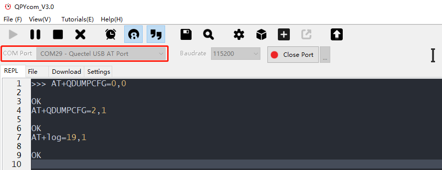 在模组正常运行时,打开QPYcom工具,“COM Port”选择“Quectel USB AT Port”,然后点击“Open port”。依次发送上述3条AT,如下所示: