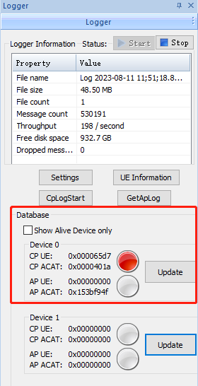 点击③处的“Update”按钮,如果选择的DB文件与模组中的固件是匹配的,则可以看到图中右边CP部分的指示灯变成绿色。