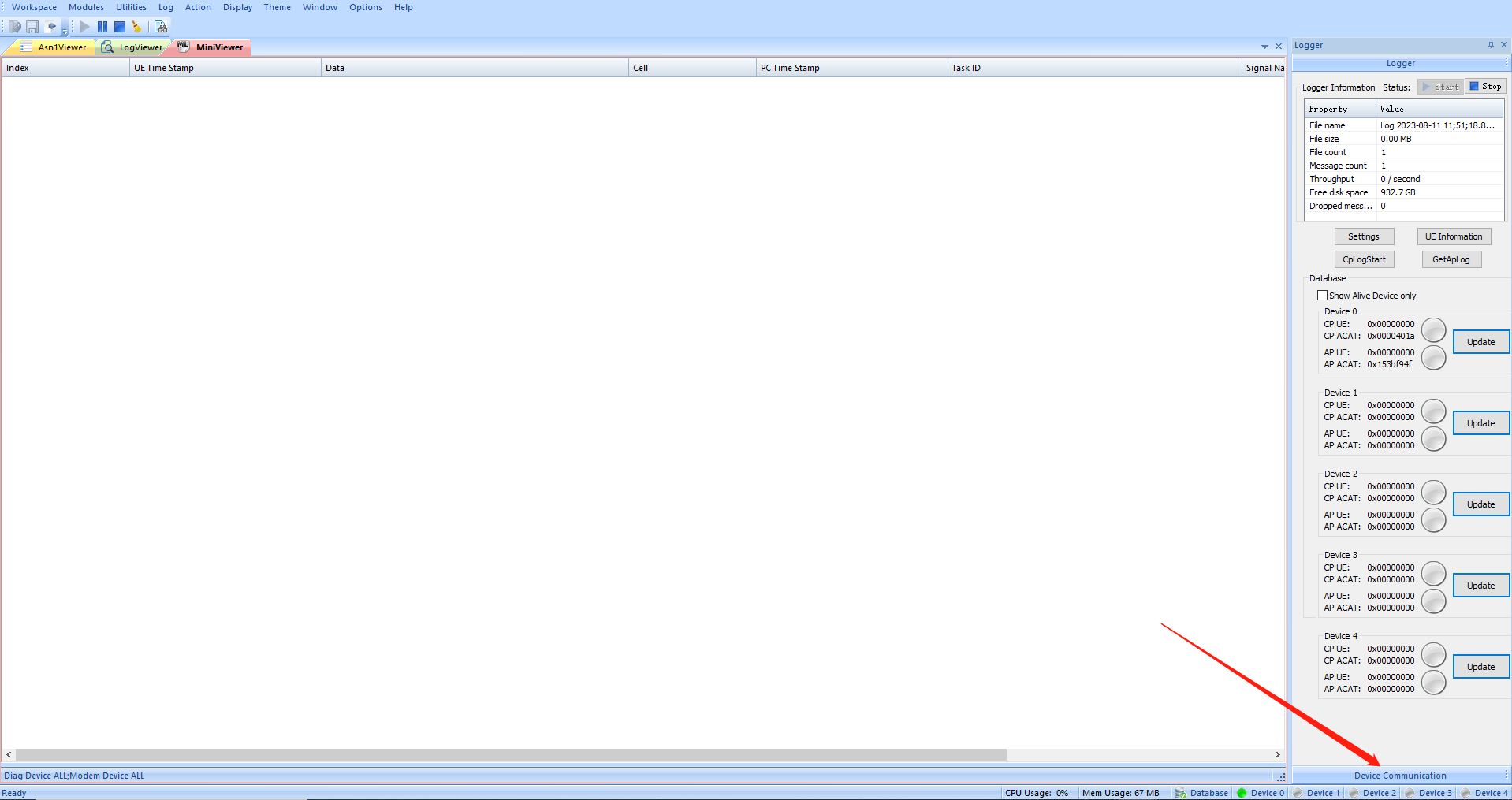 DB文件匹配成功后,点击④处的“Close”按钮,重新回到Log输出界面,此时应该可以看到上图中Device 0的指示灯也变成绿色。