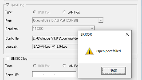 **问题1:**使用QWinLog工具抓取log失败,并弹出如下窗口,是什么原因?
