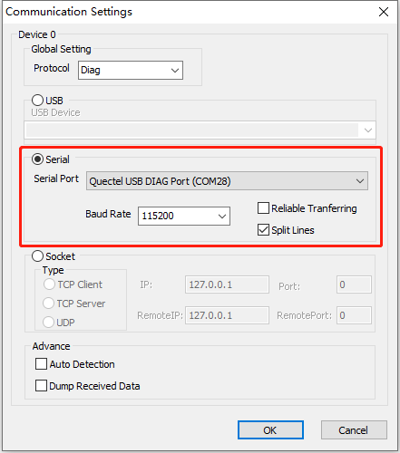 进入如下界面,选中“Serial”,点击“Serial Port”选择框的下拉按钮,选择“Quectel USB DIAG Port”端口,波特率保持默认即可,点击“OK”,之后应该就能看到工具窗口开始输出Log信息了。