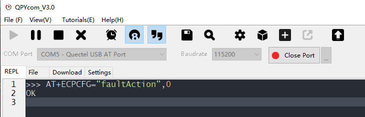 打开QPYcom工具,“COM Port”选择“Quectel USB AT Port”端口,点击“Open Port”,然后发送上面的AT指令: