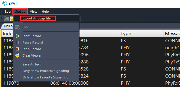 点击菜单栏的“SigLog”选项,在弹出的下拉窗口中,选择“Export As pcap file”选项。