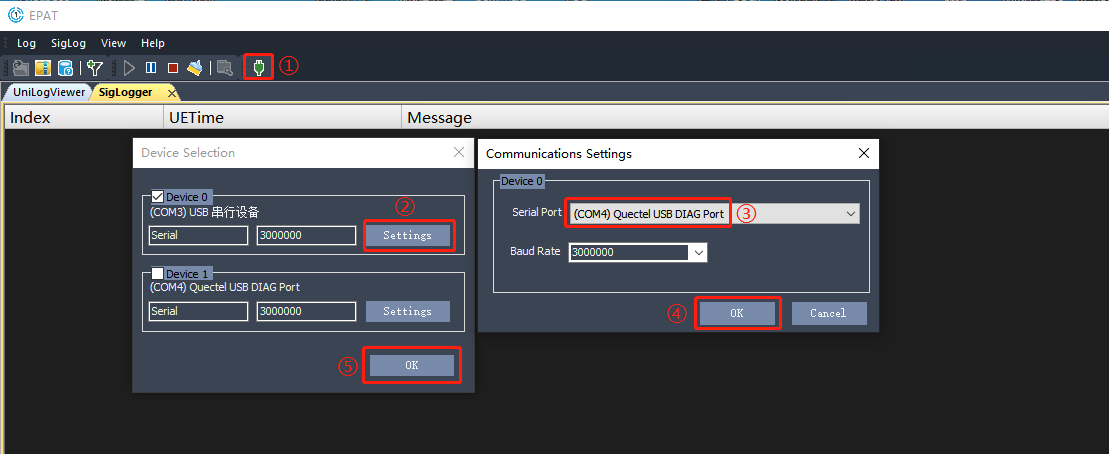 点击③处选择“Quectel USB DIAG Port”端口。然后依次点击④和⑤处的“OK”按钮。