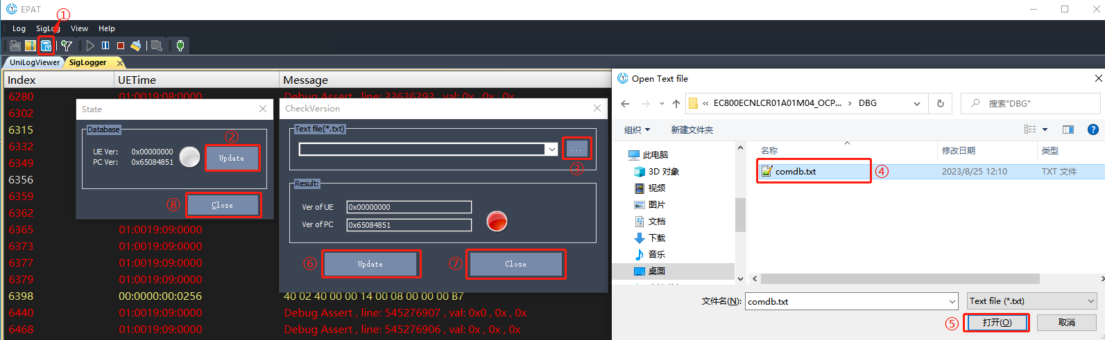 点击“CheckVersion”窗口中⑥处的“Update”按钮,然后点击⑦处的“Close”按钮。如果匹配成功,应该可以看到“State”窗口中的指示灯变成绿色。