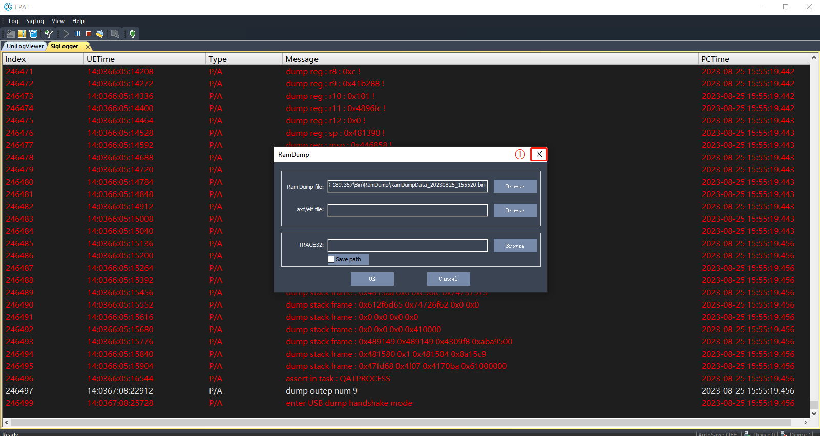 当模组出现dump问题时,EPAT工具会自动检测并开始dump文件的导出。dump文件导出完成时,会弹出如下窗口,此时dump文件已经导出并保存到计算机本地,默认保存在工具根目录下的BinRamDump目录中。用户可以直接点击图中①处的按钮关闭“RamDump”窗口。