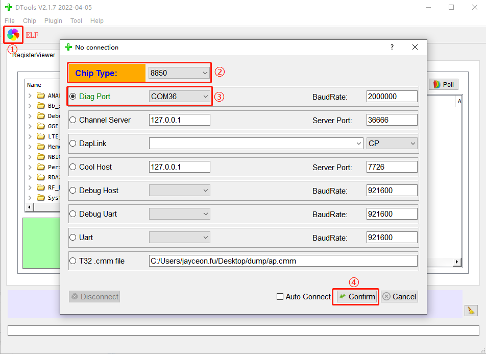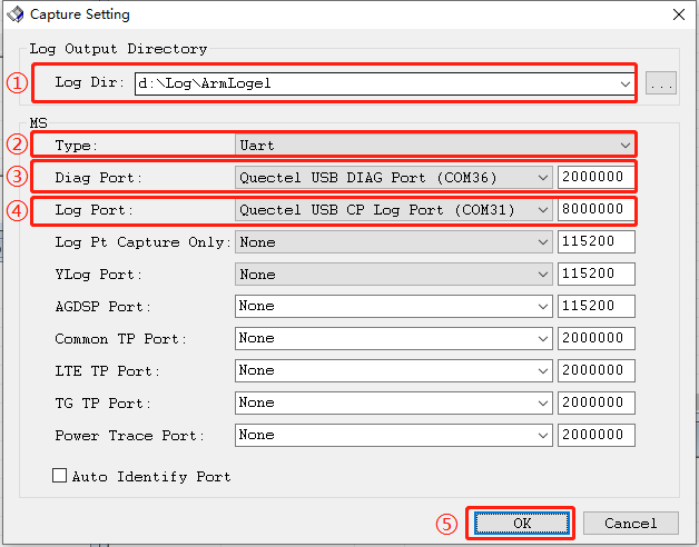 ③处的“Diag Port”选择“Quectel USB DIAG Port”,后面波特率输入框填写2000000即可。