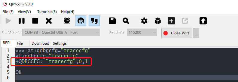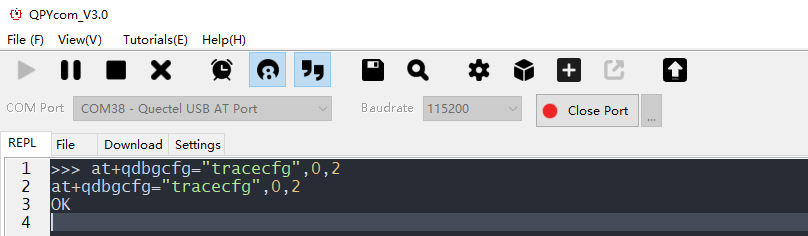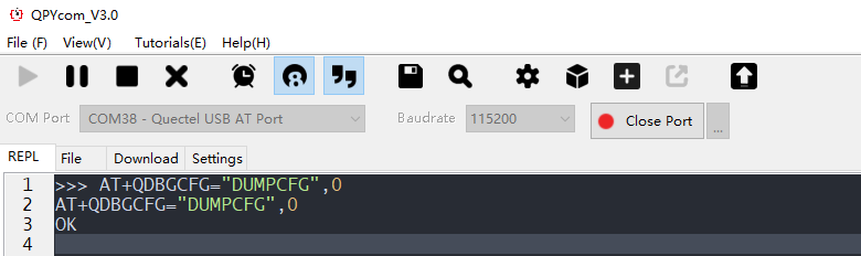 打开QPYcom工具,“COM Port”选择“Quectel USB AT Port”端口,点击“Open Port”,然后发送上面的AT指令: