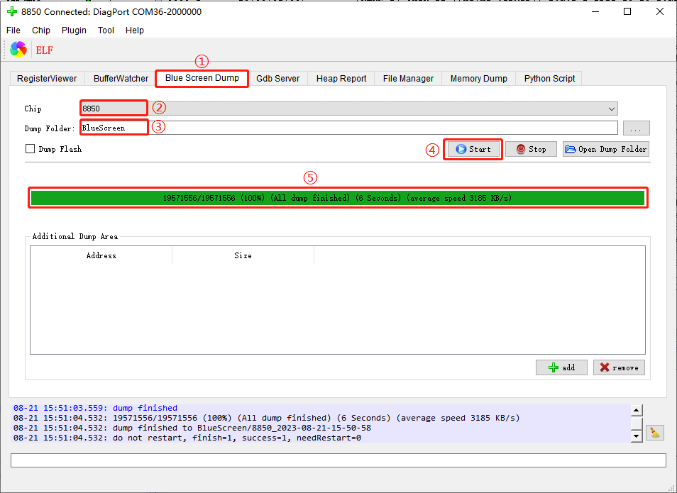 点击图中④处的按钮,开始dump文件的导出。下方⑤处会有dump文件导出的进度显示,当导出进度显示为100%时,表示dump文件导出已经完成。