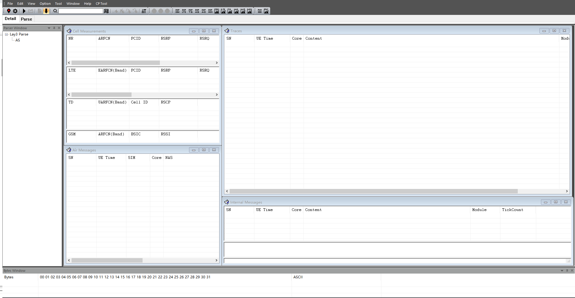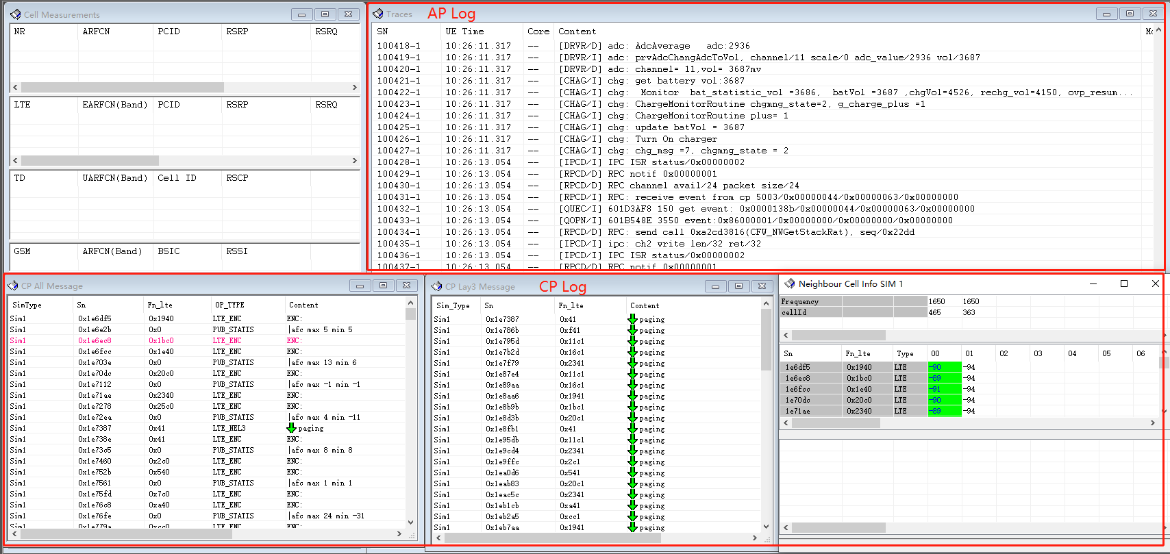 当“Capture Log”按钮变成绿色,并且“Traces”窗口能看到Log输出,说明硬件连接正常,并且工具参数配置也正确。当工具开始输出Log时,还会弹出几个新的窗口,比如“CP All Message”、"CP Lay3 Message"和“Neighbour Cell Info”窗口,这些窗口输出的是CP Log相关的信息。