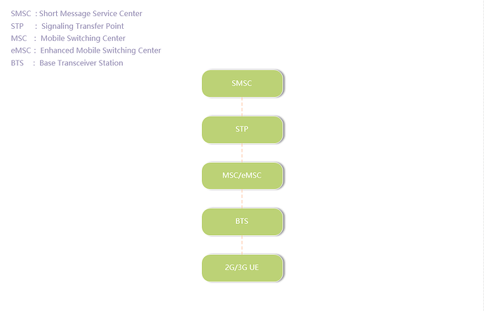 如下图2-1所示,在2G/3G时代,UE设备通过短信收发机将数据最终发送到SMSC,SMSC将收到的信息转发出去,以此完成短信通信。