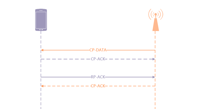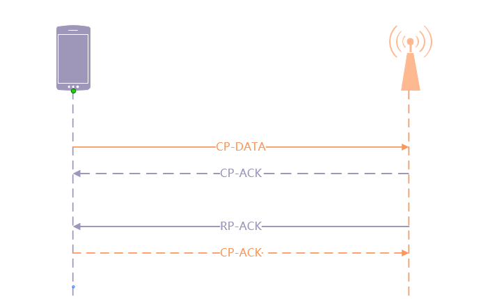 移动设备先从网络侧接收到短信,之后移动设备终端回复CP-ACK报文到网络,当短信解析完成,移动设备终端再次发送RP-ACK,网络层回复CP-ACK。