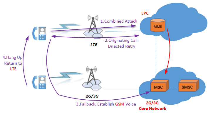 即LTE终端平常会驻留在LTE网络,当需要完成语音业务时,网络辅助终端回落到2G/3G网络的CS域,通话结束后再重新返回LTE网络。