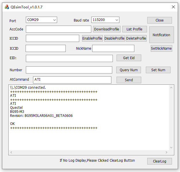 连接设备成功后,执行ATI指令,如下图所示正确显示出版本信息,则可以执行点击DownloadProfile按钮进行下载安装profile操作。