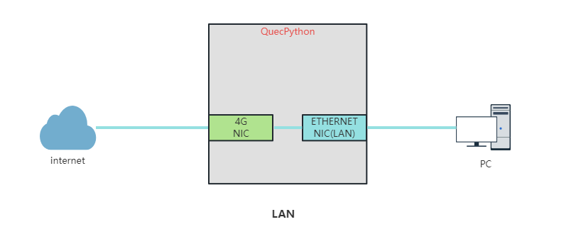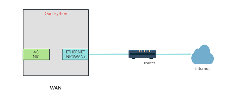 即作为 LAN 口,与另一台以太网设备连接,借助 4G 网络为外接以太网设备提供外网访问能力。模型如下图所示: