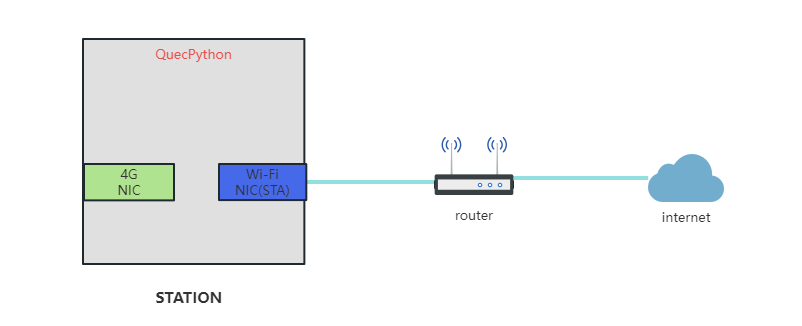 Wi-Fi 无线网卡不同的工作模式下具有不同的应用场景,对于 station 模式下,需要连接Wi-Fi 热点(比如路由器),通过 Wi-Fi 热点给模块提供网络。对于 ap 工作模式下,Wi-Fi 无线网卡作为热点,接受其它 Wi-Fi 站点设备连接,并为其提供网络服务。