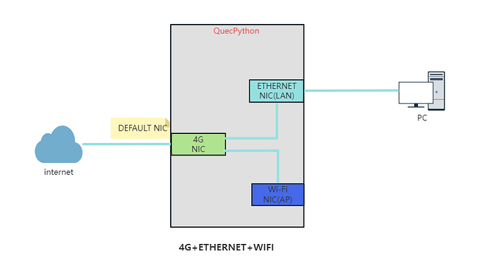 - 使用 4G 作为默认网卡,Wi-Fi 与以太网络通过 4G 转发进行网络访问。