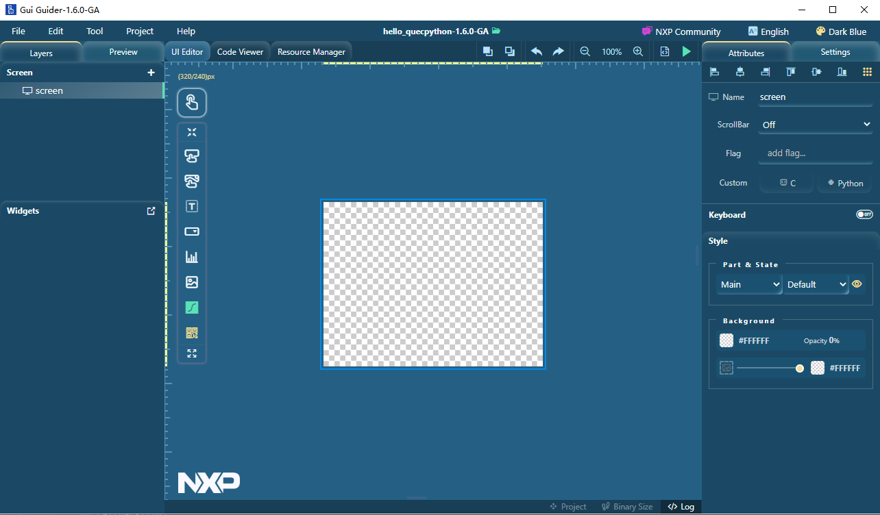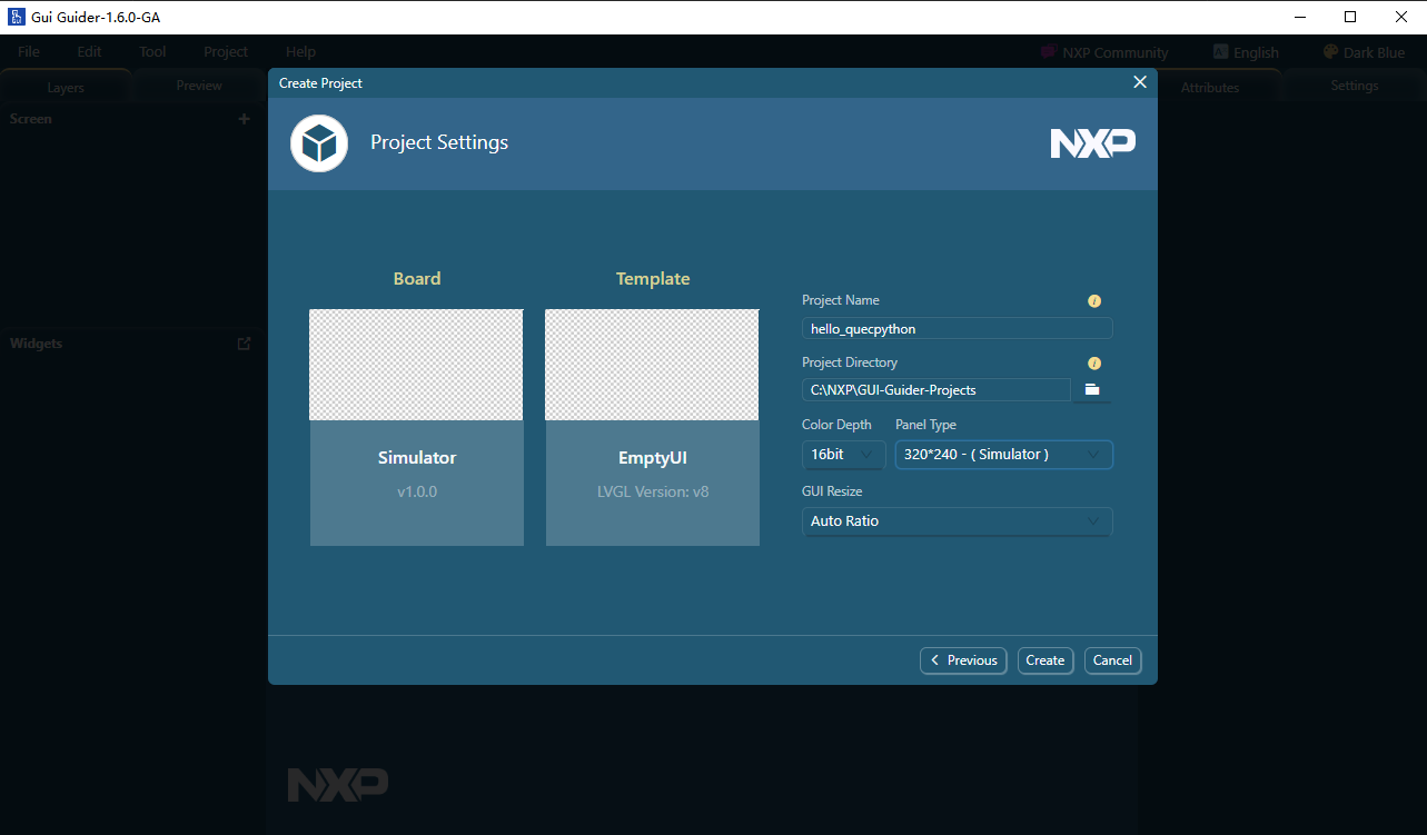 Gui Guider(恩智浦)是PC端GUI设计工具,可以通过拖放控件方式设计LVGL GUI页面,加速GUI设计。设计完成后可在PC上仿真运行,确认设计完毕后生成python脚本,再整合入模组中。完成开发。