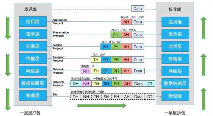 这七层分别为:应用层、表示层、会话层、传输层、网络层、数据链路层、物理层。