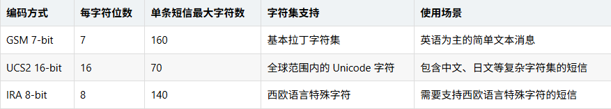 在实际发送短信时,键入的数据均为ASCII码,而ASCII码是8比特位字符数据,GSM编码是7比特位字符数据,GSM编码将ASCII码中的一些控制字符表示成了有实际意义的字符数据。在TEXT模式下,GSM编码数据需要保证7比特位的数据数值和ASCII码表中的数值完全一致,才可通过TEXT方式发送短信数据,否则将导致接收端和发送端数据不一致。
