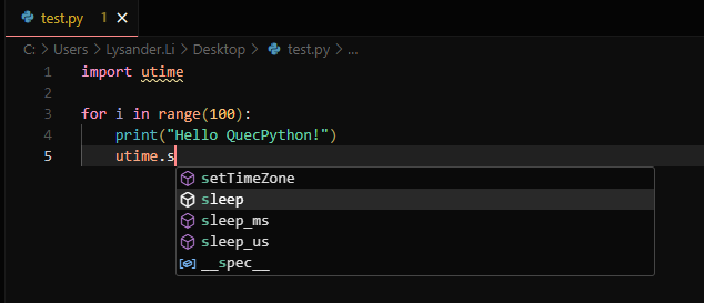 该段代码用于每间隔 1 秒钟,循环打印字符串 “Hello, QuecPython!”。由下图可以看出,当输入 QuecPython 中特有的 utime模块时,VSCode 界面会对其下包含的方法进行提示。按下上下方向键,使光标移动到需要的接口,按下 Tab 或 Enter 键,即可将代码补全到test.py文件中。