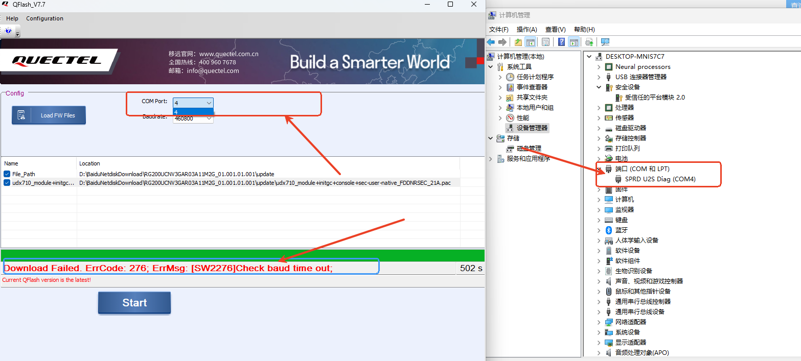设备接通电源后,长按重置按钮 仅有 SPRD U2S Diag 端口。目前按QFlash_V7.7 用户指定文档升级