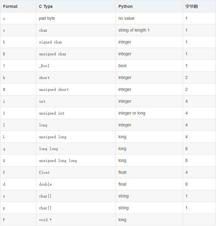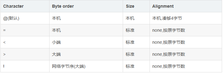 为了同c中的结构体交换数据,还要考虑有的c或c++编译器使用了字节对齐,通常是以4个字节为单位的32位系统,故而ustruct根据本地机器字节顺序转换.可以用格式中的第一个字符来改变对齐方式.定义如下: