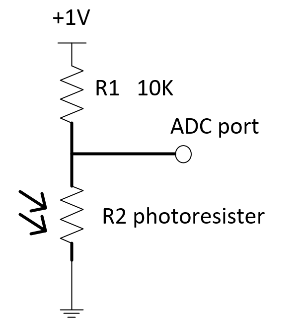 硬件连接:如下图进行连接。R2为光敏电阻,R1为10K,根据具体光敏电阻参数选择R1的值,ADC port为测试点,连接到模组的ADC管脚。