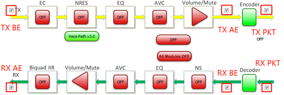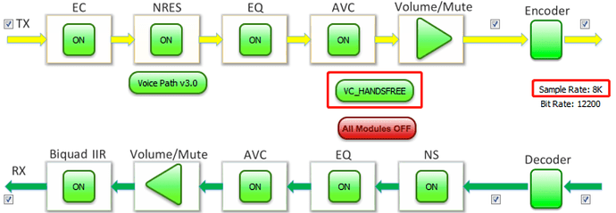 - 语音增强音频校准 语音增强拓扑图提供对所有语音增强模块的控制。它支持打开和关闭每个模块,并可以设置模块中的参数。