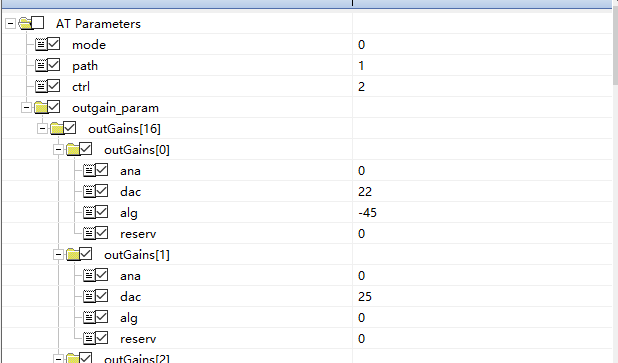 输出增益在通话模式,或者音乐播放模式下均可调。输出增益与音量等级相关,当前支持0~11级音量,分别对应增益列表中的outGains[0] ~ outGains[11]。用户若要重新调整音量增益,可以调整对应音量等级下的dac,ana与alg增益。Alg调到最小可以实现静音。DAC的值不建议超过63,易造成失真。用户可根据应用场景,设置不同的增益组合。建议可保持ana与alg不变,调整dac增益。