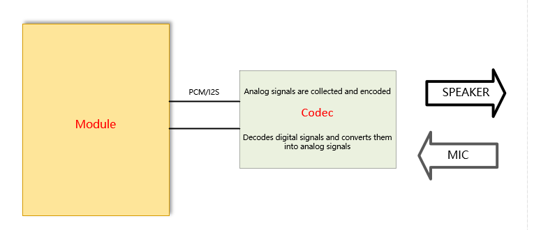 当模组内部不带内置Codec时,或者需要使用两路Codec时,可以使用PCM或者I2S接口外接Codec。此时外部输入输出模拟信号需要和Codec连接,如下图: