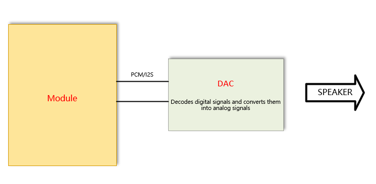 音频DAC是一种音频数模转换器,即一种将数字信号转换为模拟信号的装置,可以将存储在数字媒体中的音频数据,如CD、DVD、MP3等,转换为可以通过扬声器或耳机输出的模拟信号,使人们可以听到声音。模组可以通过PCM或者I2S接口外接DAC,如下图: