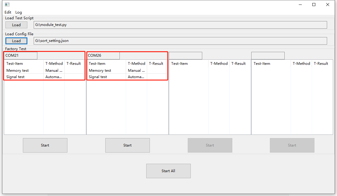 打开工具后,点击 选择 按钮,分别选择上一步编辑好的测试代码和配置文件,若有检测到串口,则该串口下会显示每一项测试名称以及测试方式。