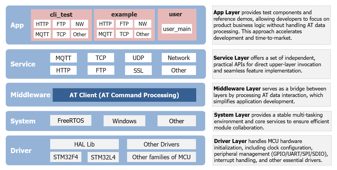 - 支持自动处理AT命令和数据交互,同时具备URC和异常处理能力
