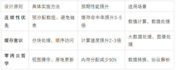 这种连续内存布局带来了多重好处:首先,它大幅减少了内存开销,消除了每个元素的对象头开销;其次,它提高了缓存效率,因为相关数据在物理内存中是连续的;最后,它简化了内存管理,只需要一次分配和释放操作。
