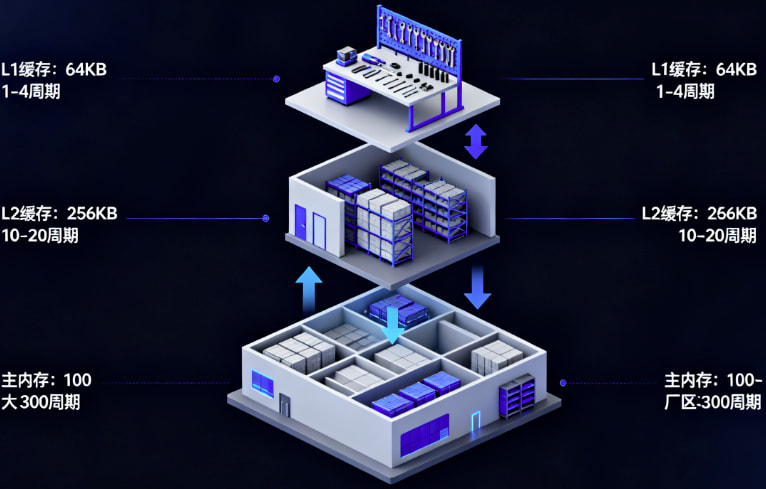 1. L1缓存(约64KB,1-4周期) - 就像工作台旁边的工具架,存取极快但容量小
