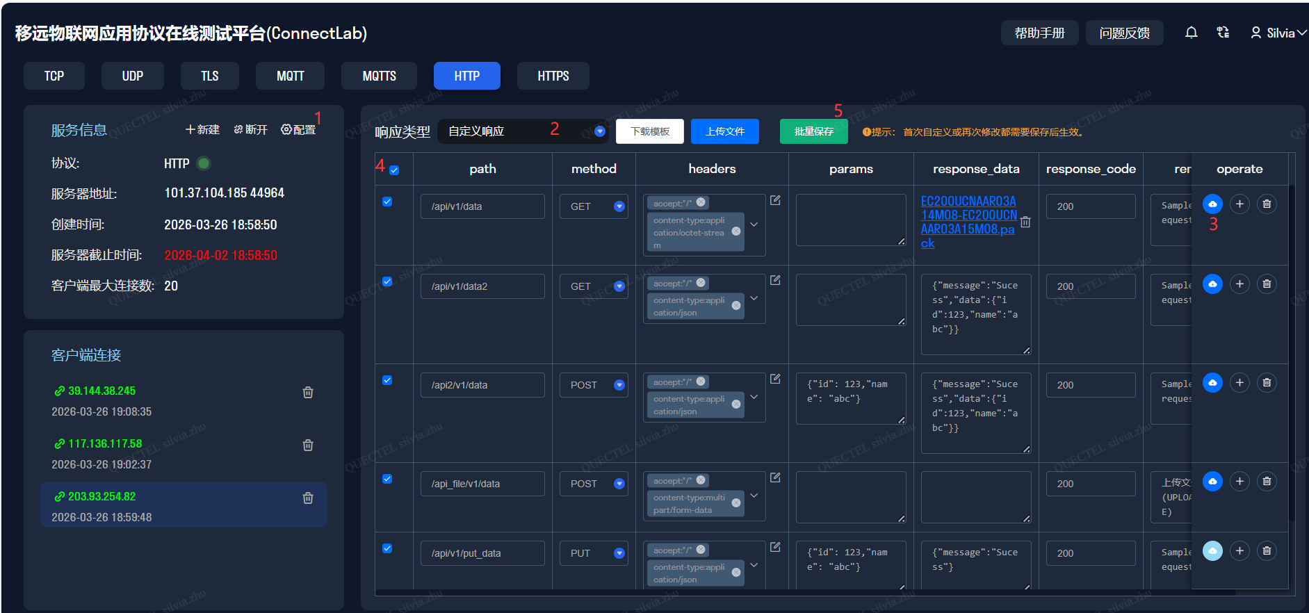 自定义响应:客户可根据需要自定义请求头header设置、parameters及响应数据,设置完之后,点击批量保存即可。其中params和response_data支持上传文件。目前支持的文件格式包括.txt/.zip/.pack/.bin/.par,文件最大限制为50M。点击operate里的上传按钮,可上传对应的文件,如需要下载的文件或者差分包都可以。