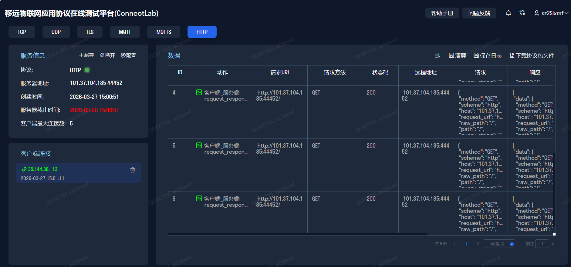 以EC200U为例,模组为HTTP客户端,连接ConnectLab创建的HTTP Server: